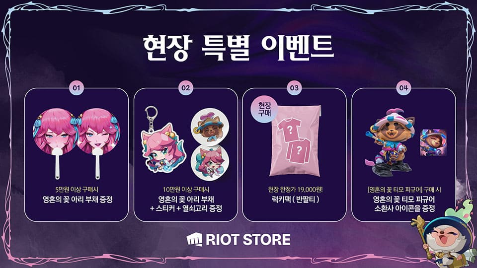 라이엇 스토어에서는 팝업 한정 굿즈도 만나볼 수 있는데요, 구매 금액별로 ‘영혼의 꽃 아리 키링’도 받을 수 있으니 팬이라면 꼭 방문해보세요.